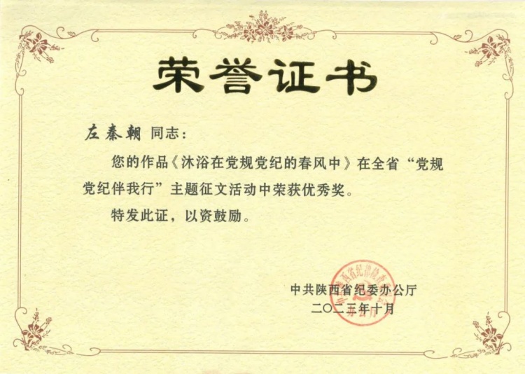 近日,陜西省紀(jì)委辦公廳公布了“黨規(guī)黨紀(jì)伴我行”主題征文活動(dòng)表彰決定,陜西工勘院紀(jì)委選送的由公司紀(jì)委委員、副總工程師左秦朝撰寫的《沐浴在黨規(guī)黨紀(jì)的春風(fēng)中》榮獲優(yōu)秀獎(jiǎng)。